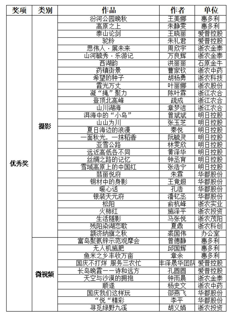 經(jīng)集團(tuán)內(nèi)外評(píng)委評(píng)議,明日控股崔志浩的單幅作品《古代和現(xiàn)代的碰撞》、明日控股邱旸歆的組照作品《山河遠(yuǎn)闊 國(guó)泰民安》、浙農(nóng)科技符銀川的組照作品《沃野金麥繪豐圖:農(nóng)業(yè)夢(mèng)之卷》獲攝影組一等獎(jiǎng),明日控股俞濤《滄海一粟》等6件作品獲二等獎(jiǎng),惠多利韋揚(yáng)《晚秋》等9件作品獲三等獎(jiǎng);浙農(nóng)農(nóng)業(yè)甘良的作品《慶祝祖國(guó)母親生日快樂!》獲微視頻組一等獎(jiǎng),浙農(nóng)股份申琪婧《浙農(nóng)青年采菊活動(dòng)》、明日控股俞燁敏《最美風(fēng)景》獲二等獎(jiǎng),金誠汽車陳練翠《信仰的顏色是紅色》、華通商貿(mào)陸嘉琦《山不見我,我自去見山》、明日控股蔡佳楠《山清水秀-大洋塢水庫》等3件作品獲三等獎(jiǎng)。